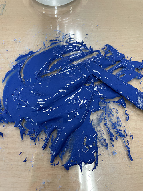 ガラス板の上にラピスラズリの顔料を出し、アラビアゴムを垂らしてパレットナイフで混ぜていきます。