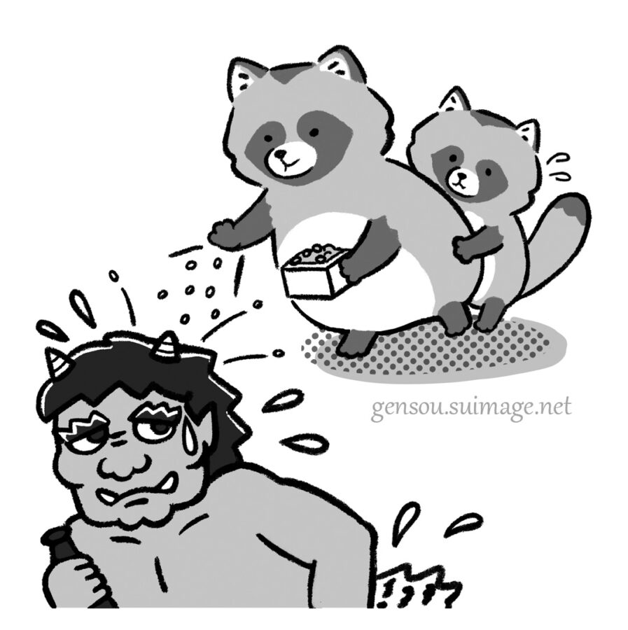 鬼に豆を投げる勇ましいお母さんタヌキ。