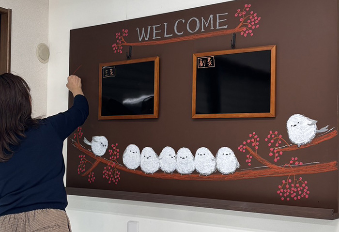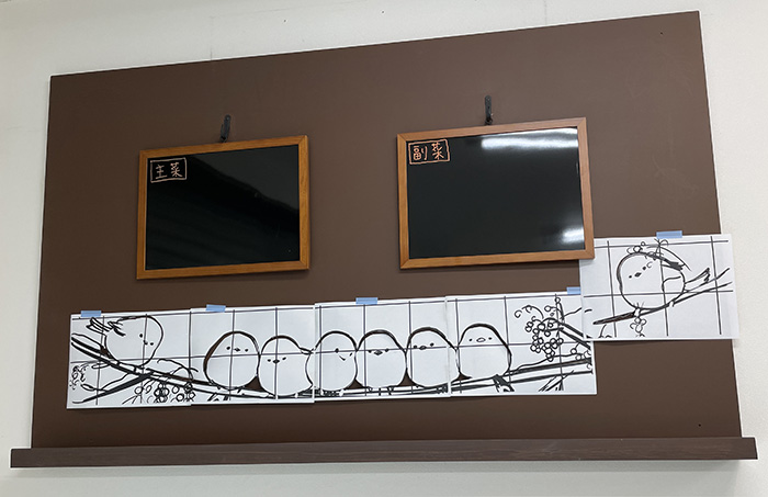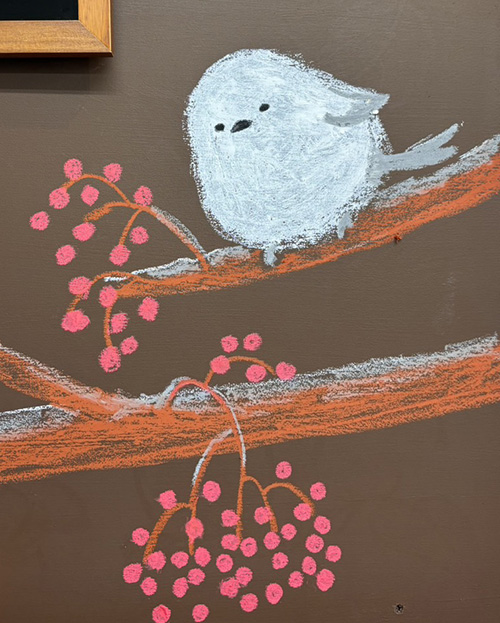 朝は、店内黒板イラストをお任せしていただいているお惣菜やさんで、冬仕様のイラストに描き変えに行きました。