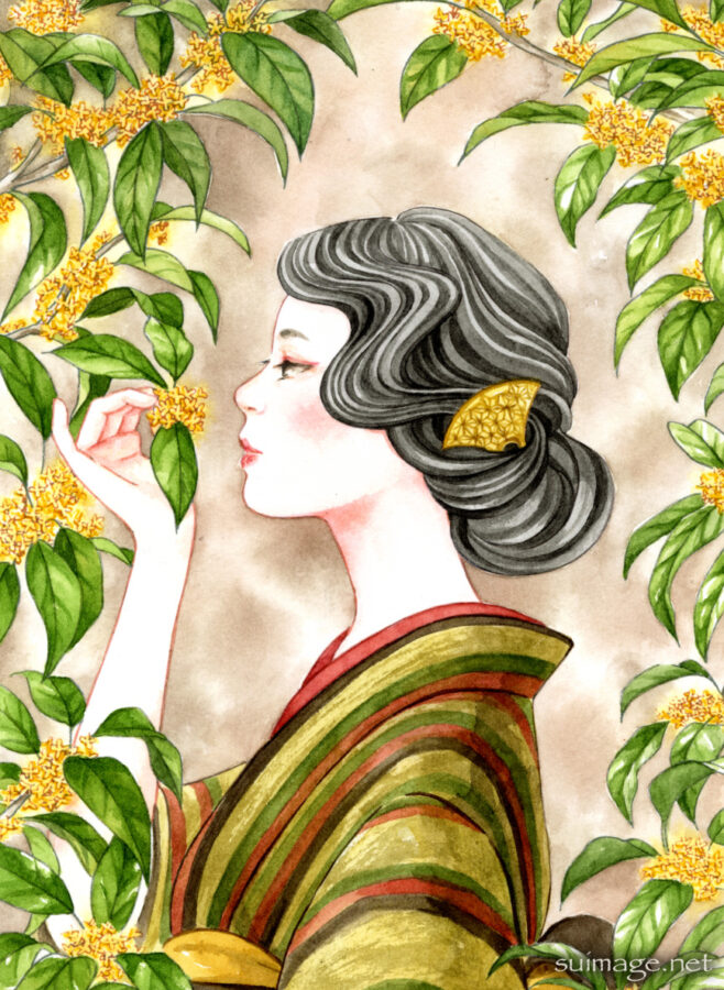 和装女性がまとう繊細な空気や、歴史のひとコマを切り取ったようなドラマチックな構図を大切に描いています。