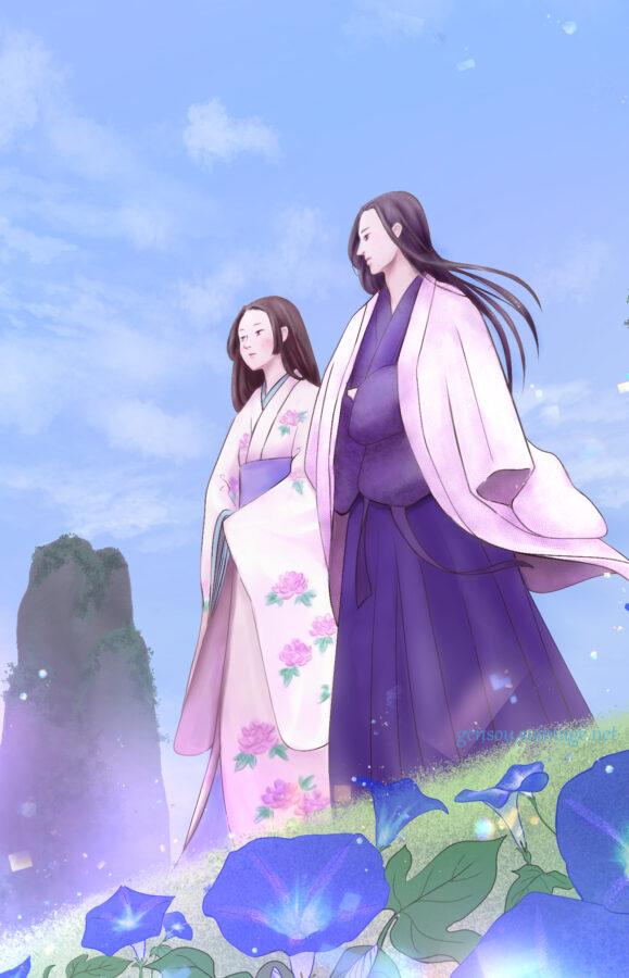 人物(姫と武士)はあえて描きこまず想像の余地を残しています。