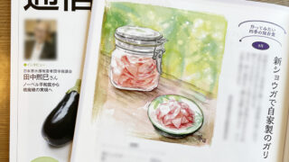 「食べもの通信」〜作ってみたい四季の保存食〜、7月号はシソジュースと材料の紫蘇を描きました。 シソシロップの鮮やかな赤紫色を表現したい・・・ そのため、室内に置かれたガラスの食器に入ったシソジュースをイメージしました。 … 続きを読む 「食べもの通信7・8月号」挿絵 シソジュース、新生姜ガリ