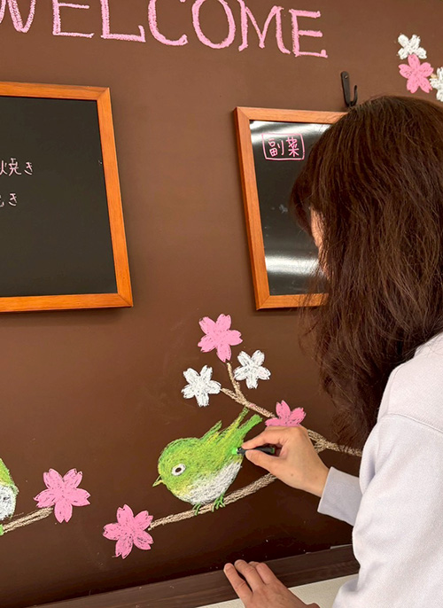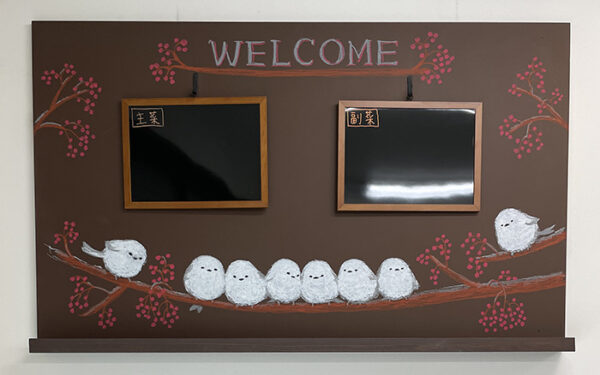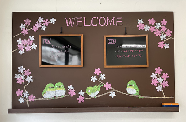 お花見弁当の定番、鶏そぼろを春らしく描いたお仕事と黒板アートをご紹介します。