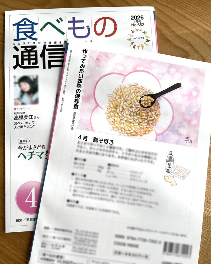 桜の季節の食べものイラスト制作|「食べもの通信」4月号 鶏そぼろ挿絵と黒板アート